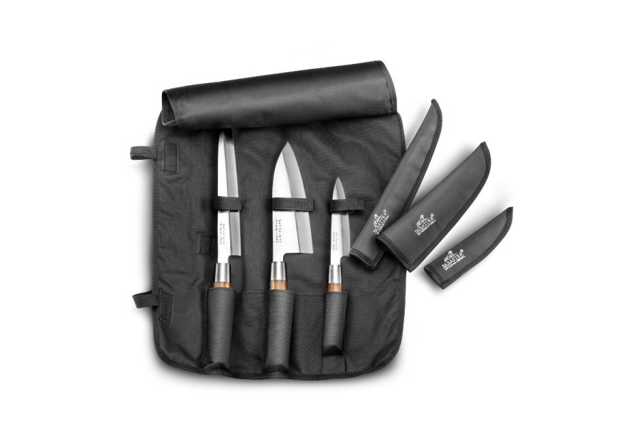 La trousse est fournie avec une housse brodée compacte et élégante, dotée de compartiments dédiés pour un rangement et un transport sécurisés. Des fourreaux de protection complètent l’ensemble afin de préserver les lames et garantir une sécurité maximale.