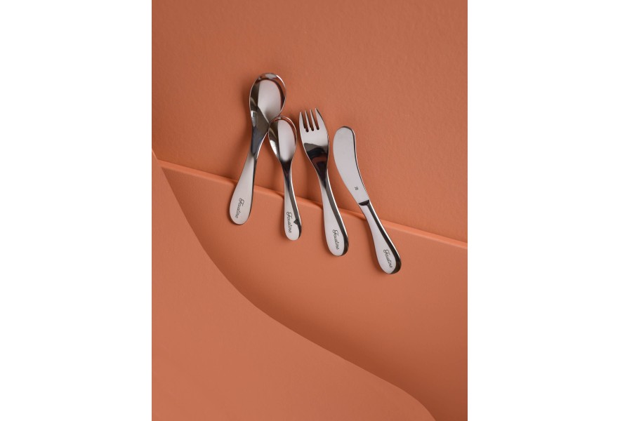 Offrez à votre enfant un set de couverts adapté à ses petites mains avec le Set de Couverts Enfant 4 Pièces Knuddel. Conçu spécialement pour les tout-petits à partir de 3 ans, ce set inclut une fourchette, un couteau, une grosse cuillère et une petite cuillère, offrant ainsi tout le nécessaire pour les repas quotidiens. Fabriqués en Cromargan® (acier inoxydable 18/10 brillant), ces couverts sont non seulement robustes et durables, mais aussi sûrs pour les enfants grâce à leur forme ergonomique qui facilite leur prise en main. Ce set accompagne votre enfant de manière ludique dans l’apprentissage des bonnes manières à table tout en lui offrant un confort optimal. Adaptés à un usage quotidien, les couverts Knuddel sont également pratiques pour les parents : leur entretien est simple et rapide, car ils peuvent être mis au lave-vaisselle sans risque. Ce set de couverts est donc un choix parfait, à la fois fonctionnel et élégant, et constitue un cadeau idéal pour les enfants. Transformez les repas en moments agréables avec ce set de couverts enfant pratique et ludique, qui combine sécurité, confort et facilité d’utilisation !
