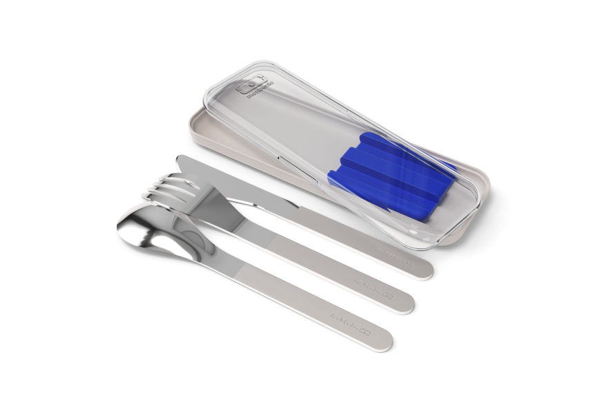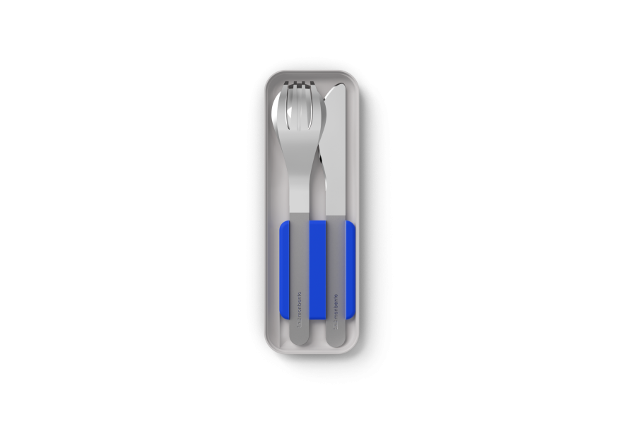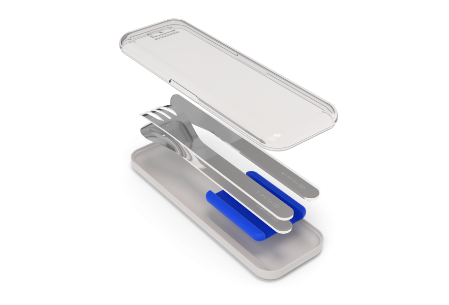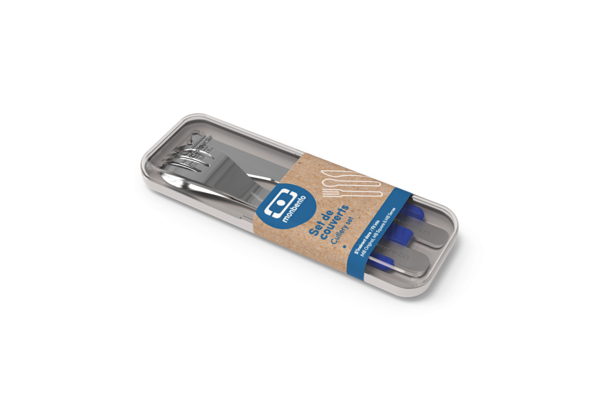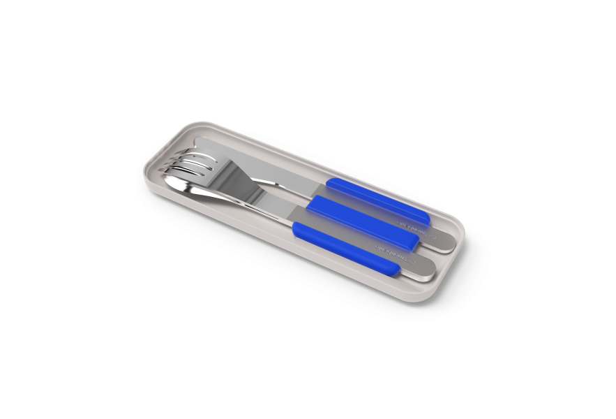 Ce set de couverts nomades avec son support bleu, fabriqué en acier inoxydable avec un design ergonomique et personnalisable par gravure laser, est l’accessoire idéal pour sublimer vos repas en déplacement.